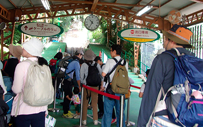 | バスを降りて目の前には沢山の人がいました。麻耶ロープウエイを利用する人達で切符売り場には長蛇の列で、最後尾は公園の中にまで伸びていました。臨時便が出るとは言ってますが一体いつになったら乗れるやら・・・。土曜日とあって子供連れの方やアサギマダラ目当ての人達で賑わっていました。 |