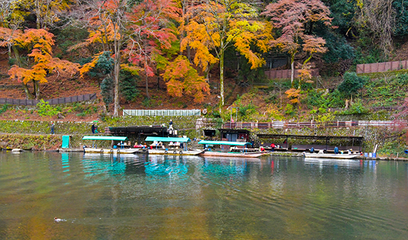 『トロッコ列車は、もともと荷物輸送用の小型貨車として、トラックや通常の列車が入れない場所にレールを敷いて走らせた箱型車両のことです。ゴトゴトとゆっくり走る、素朴な列車。そんなイメージにぴったりなのが、嵯峨野トロッコ列車です。ちょっと速い自転車くらいの速さです。だからこそ楽しめる保津川沿いの自然や渓谷美、片道約7kmおよそ25分の間、色とりどりに染まった風景をゆっくり楽しめます』