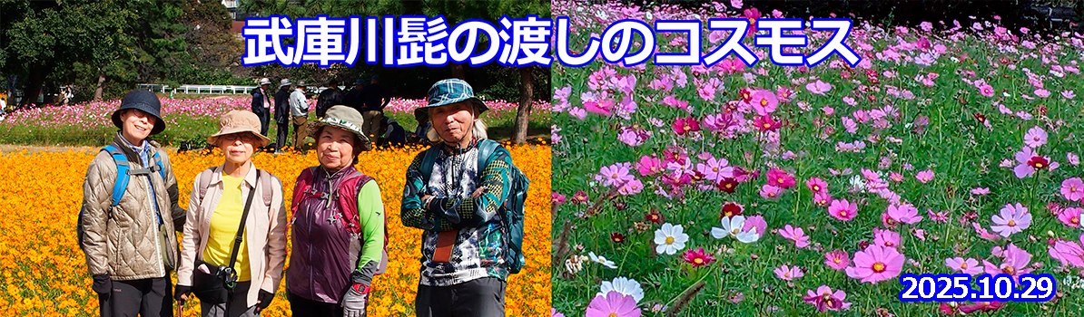 秋の冷たささえ感じる風を頬に受けながら武庫川河川敷を歩き山手大橋の下、山陽新幹線の下をくぐります。上武庫橋下、阪急電車下を過ぎて甲武橋までやってきました。今迄は右岸を歩いていたのですがここからは左岸へ移動です。河川敷に下りて山陽新幹線の下をくぐり、やっと武庫川コスモス園到着しました。