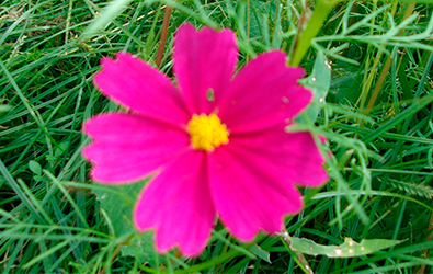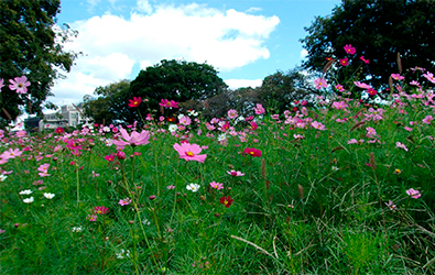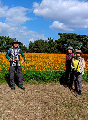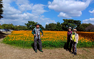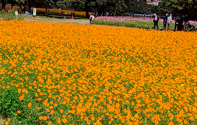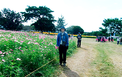 | 初めに目に入ったのは黄色のお花畑でした「これってコスモスなの?」ちょっとイメージが狂ってしまいましたがキバナコスモスというらしいです。キバナコスモスの遥か向こうに色とりどりの可憐なコスモスが私達の来るのを待っていたかの様に綺麗に咲いていて満開です。まさに秋の桜です。 |