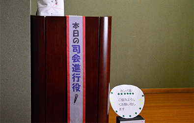 久し振りの再会に花が咲き満開です。やっと開催時間となったため会場に入って貰うことにしました。入口でお渡しした座席表を忘れて来た人多しで「やっぱりかぁ」控えでおいて良かったです。座席に案内をして開会を待ちます。 |