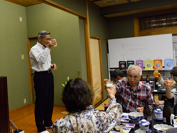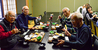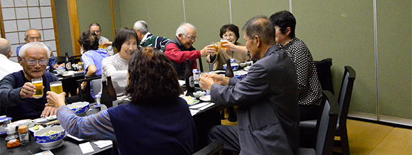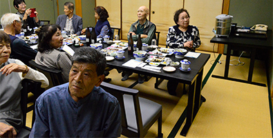 | ほどよい時間が経ち近況報告の時間となりました。順番に全員の近況報告が始まりました。農作業をしている人が多く、玉ねぎを200本植えた、オレは300本だのニワトリを飼っている人もいました。パイナップルが芽を出したという人もいました。腰が痛いだの耳が遠くなりにけりだと賑やかでした。 |