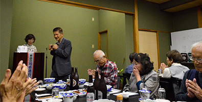 | プログラムには舞の森の名前のいわれ、歴代の旅行地、そして19名の物故者の栞も用意しています。司会者は関西支部長の操さん、今迄にないスタイルに少し戸惑いもあったかも知れませんが最後なので式次第に乗っ取り粛々と進めることにしました。うぐいすの様な可憐な声で開会宣言、続いて武村会長の挨拶です。マイクを渡すと、おもむろに原稿を出し「真面目モード」の挨拶、第1回目からの苦労、生徒数、担任の先生の名前とそれはそれは素晴らしい内容でした。部屋にこもり一生懸命考えて下さったんだと思います。 |