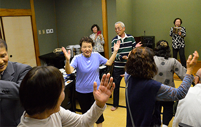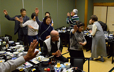 富恵師匠を先頭に全員参加で輪を作り別れの寂しさを隠す様に元気に踊りました。記念撮影は舞台に集まってもらいホテルのスタッフを呼びシャッターを押してもらいました。
