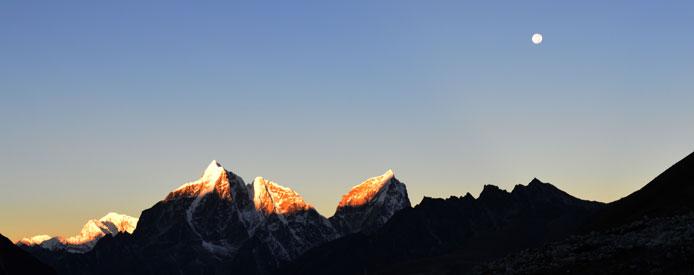 | 終わる頃「みなさん〜お茶の時間ですよ」とタイミングよく美味しいお茶をダイニングテントの中で頂くことができました。 ネパールの若いスタッフは日本でいう昼寝の時間を取ります「ネパールスリーピングタイム」とでもいうのでしょうか。とにかくよく働きます。自分たちのテントに入りハイキャンプ行きの準備です。ジャムジャムクラブ社長が行くか下山か厳しい選択ではありますが決断を下す日が迫っていました。 陽が沈むとローチェの上にカシオペア座が浮かんでいます。北極星の探索測定方式に従い5倍にしてたどってみると間違いなく北極星です。オリオン座も確認できます。 いよいよ明日はクライミングギアーやスノーブーツ、アタック時に着用するウエア類をハイキャンプに運び上げます。 |