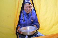 | 朝起きるとメイク落としのシートがシャーベット状になっている。水筒の水も、ダッフルバックの上に置いていたカメラも動かない。コンタクトレンズケースの中の液が凍り氷柱のようになっていました。ポーターさんが洗面器にお湯を運んでくれて温かいお茶も運んでくれました。テントの中も外もあまり温度は変わらず寒いです。本日の行動開始はいつもより1時間遅くて助かりました。まずコンロでお湯を沸かしコンタクトレンズを解凍することにしました。朝食はゆうべの残りで雑炊をしました。腹痛のため硬水を身体に入れないようにして飲み物に充分気を付けています。朝の飲み物がテントの中に運ばれてきました。「もう少ししたら食事です。しばらく待って下さい」と至れり尽くせりのおもてなしを受ける。「まるでお雛様みたいやね」わかったかどうかはわかりませんがニコッと笑って炊事テントに帰って行きました。 |