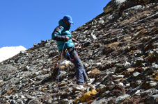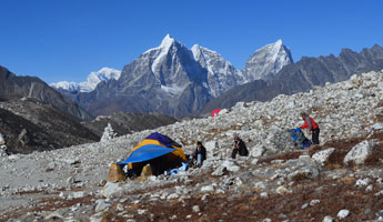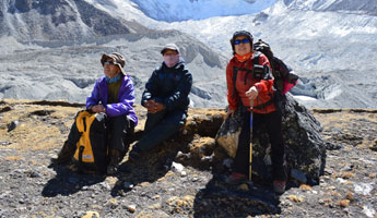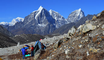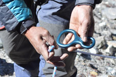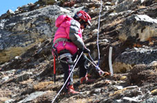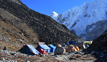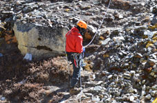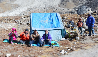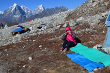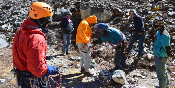| 3時間ほどの高所順応のハイキングを終えベースキャンプに帰ってきました。 帰ってくるとニマ・クライミングリーダーによる講習会がテント場のすぐそばで行われることになりました。 5100bのハイキャンプから5700bのアタックキャンプまでのトレーニングはクライミングリーダーの「無駄な体力の消耗は避けた方が良い」と言う提案で実技講習に変更となりました。此の頃になると高山病で苦しんでいたジャムジャムクラブ社長も少し回復した様子で講習を受けられる状態になっていました。 多少クライミングシステムが日本と違うものの、すべてネパール方式に合わせて実技講習を終えることができました。 |