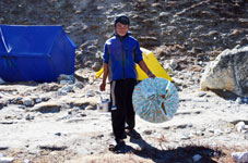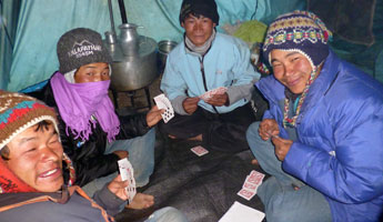 全ての仕事が終わって私達が眠りにつくころ、ポーターさんたちの自由時間です。トランプに興じている姿からは疲れなどというものは感じられません。 多くの山岳隊やクライマー達がいとも簡単に登ったように話しておられますが、彼らの協力なくしてサミットは踏めません。 彼らのパワーと笑顔に助けられて山を征服された方は多いのではないでしょうか。 |