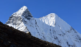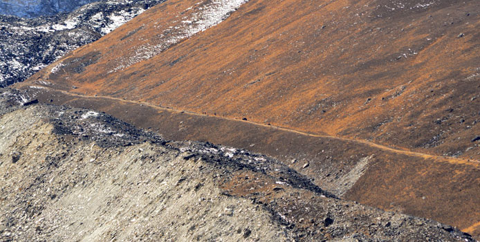 | アマダブラを巻くように延びるアンブラプチャ・ラへの道…この道を辿るとやがてメラピークへ到達します。 この景色を遠めに見ながら「人が歩いている」とマッチンドラーが言う。望遠レンズで探しても解らない。彼がカメラを貸してといい撮ってくれた一枚です。中央に3名歩いています。それにしても彼らの眼は良い。驚くばかり。 この道はヤクもゾッキョも通行禁止だそうです。ポーターさんの人力に頼るだけです。 |