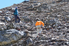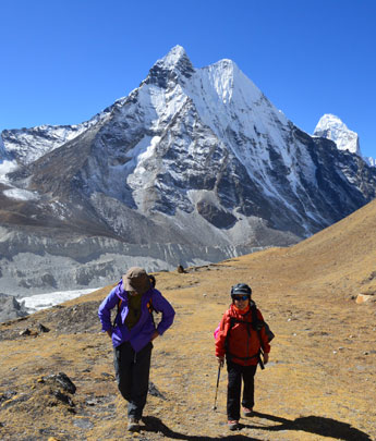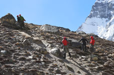 | 食事のあとは高度を慣らすためにハイキングです。ところがジャムジヤムクラブ社長が高山病を発しパルスオキシメーターの数値が52〜53を示しており危険信号のため下山するかどうかをみんなで検討することにしました。姫の下痢は何とか止っているようですが代わりにジョンがピーッ!だそうです。島田氏は便秘になり昨夜はテントの中に座って朝を待っていたらしいです。みんな何らかの症状を訴え始めました。 島田氏、ジョン、ひめはマッチンドラーのリードでハイキングに出かけることにしました。 「おい!サンダル履きかよ?」 「ネパールのガイドはハイキングはすべてサンダル履きです」 そういえばナムチェの高度順応の時もサンダルやったなぁ。日本ではとても考えられません。 「ヒマラヤでは大丈夫ね」 私達が高価な登山靴で歩くよりサンダル履きで軽快なフットワークで歩けるのだから現地の人は凄い! |
