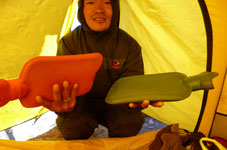 食事が終わるころ、テントに湯たんぽが運ばれてきます。 氷点下のテントの中ではとても助かりました。 湯たんぽを受け取ったら一刻も早くシュラフの中にいれなければすぐに冷えてしまいます。私は取り敢えずダウンジャケットの中に入れて暖をとりました。それからしばらくしてシュラフの中に入れて休みました。 暖かさは朝まではもちませんでしたが、充分氷点下のテント生活に耐えることができました。 |