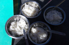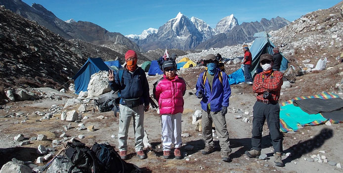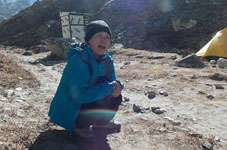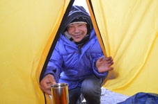 | テント場の朝はクックボーイのティーサービスからはじまります。今日はアタックキャンプへ移動です。 姫もJONも体調が優れないままアタックキャンプへ向かいます。 昨夜はハイキャンプへ移動を控え食事棟で「しあわせなら手をたたこう」と「ソーラン節」をみんなで楽しく歌いました。テントの外を歩く人にはアイランドピーク制覇に成功した後の宴かと勘違いされるほどの盛り上がりでした。 この歌を聞きつけた北海道出身でドイツ在住のフクダさんという女性は、ぜひ拝顔したいと声をかけてくださいました。日本人ガイド2名とクライアント2名とコンティニアンスパートナー1名でプラタドルというところからアイランドピークに挑戦するのだそうです。 |