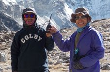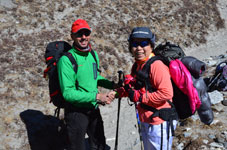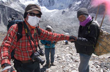 | ハイキャンプへの登攀路でアイランドピークから降りて来たクライマーとしばし歓談。登頂成功にエールをおくると「ガンバッテクダサイ」という返事。わずかな時間ですが楽しいひとときです。 | ||