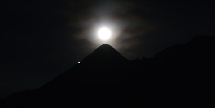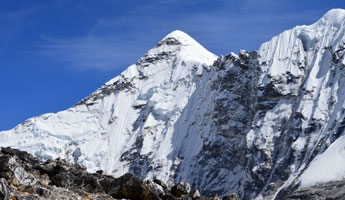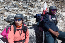 | 道中では雪焼けをした、見るからにアイランドピーク制覇してきましたと自信満々の欧米人が日の丸を見つけ「ジャパン?アタック?」と聞いてきました。ガンバレと言わんばかりに握手を求めてきました。英雄の顔をしています。空気が薄くなり一歩進むのにゼェゼェハァハァと何十回も休憩を取りながら正午すぎにやっとハイキャンプに到着しました。 明日は深夜12時30分集合で午前1時出発し氷壁を登り頂上には午前8時までには登頂したいとのクライミングリーダーの説明でした。下りは250bの懸垂下降があり、何度も掛け替え作業を繰り返しながら登攀している自分の姿を思い浮かべ、おじけづいている自分がいます。 何としても姫旗を頂上で広げたいものです。 |