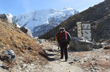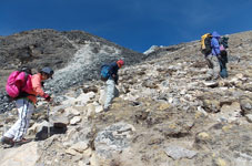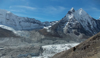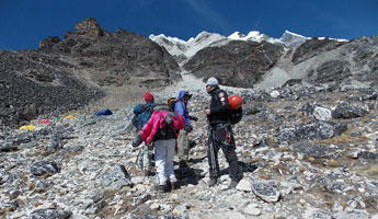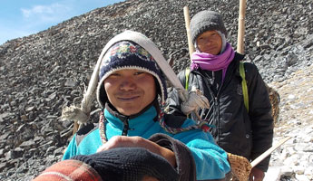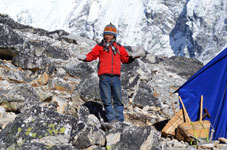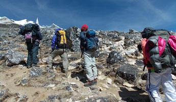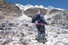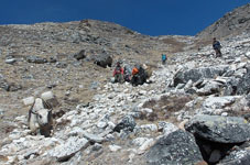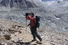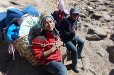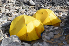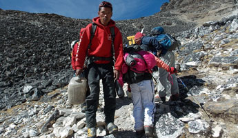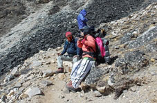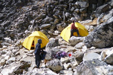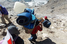 | ベースキャンプからハイキャンプへ荷揚げが終わったポーターさん達がベースキャンプへもどっていきます。彼らのパワーには敬服あるのみです。前は高校の英語の先生、後ろは高校生のようです。ヒンズーの国をあげてのお祭りのため2ケ月間学校がお休みのようで、その間にアルバイトに来ているのだそうです。 テントはポーターさん達の手によってハイキャンプに荷揚げされ、私達が到着した時には既にハイキャンプに張られていました。 |