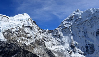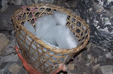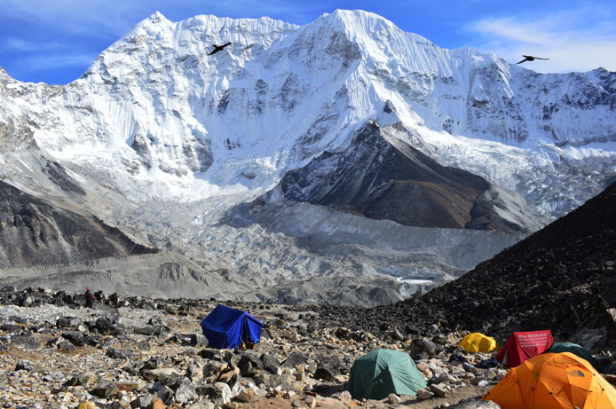 | ベースキャンプから持ち上げた8gの水を溢してしまった為、ニマ・クライミングリーダーとクックボーイのローチャンは尾根を越えたところにある氷河まで氷を採りに行ってきてくれました。 |