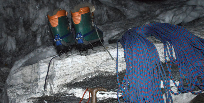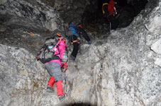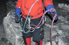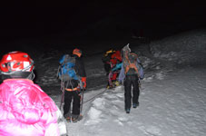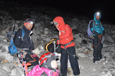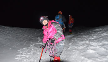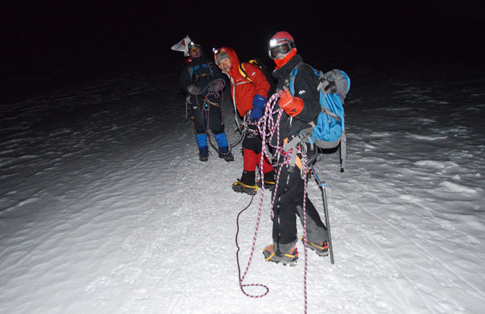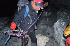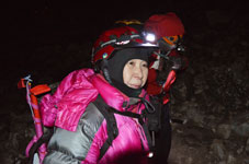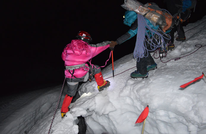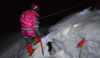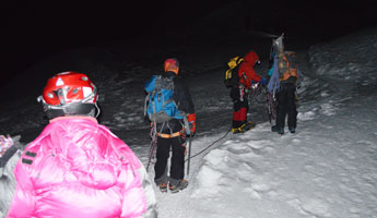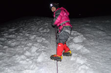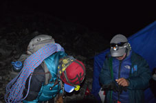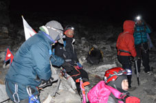 | 石コロだらけの真っ暗の山道を何時間もかけて、ゆっくりゆっくり、アイランドピークの取り付き点まで登って行きます。休憩ごとに岩陰に走る姫の姿がありクライミングリーダーのニマさんが「大丈夫ですか?」と声を掛けてくれます。ひょっとして寸前で登るなって言われるかも知れません。一抹の不安がこの時はじめてよぎりました。下の方を見るとヘッドライトの光が近づいてきます。他のパーティも出発した様子です。 4時丁度。アイゼンチェンジポイントに到着です。ここからアイゼン、ハーネスを装着し完全装備、お互いをアンザイレンで結びクレバスの中に入っていきます。この状態でアイランドピークへの氷壁取り付き点まで進んで行きます。 |
