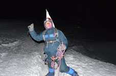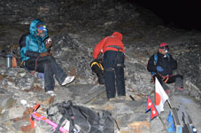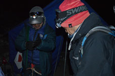 | やっと登頂の日を迎えました。12日間という日数をかけガイド・ポーター10名以上に助けられこの日を迎えました。今日のリーダーはクライミングリーダー認定資格を持つ「ニマ・シェルパさん」そしてサブリーダーにマッチンドラーさんが付いてくれることになりました。 (マッチンドラーさんは来年2月にクライミング認定資格のテストを受けるそうです。ガンバレ!) 午前1時。準備を終え6180bに向けていよいよ出発、アタック開始です。ハイキャンプには数張りのテントが張られていますが私達が一番乗りの様子です。 |