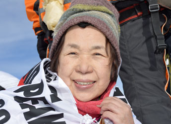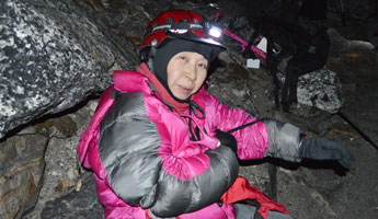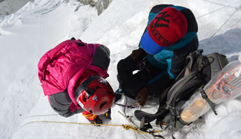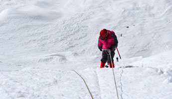 | 夜も明け始めた午前5時過ぎ、あたりがうっすらと明るくなりました。取りつき点直下に到着です。クライミングリーダーがポイントを打ちながらロープ設置のために登って行きました。 上と下では無線機を使いGОサインを出しています。いよいよユマールを付けピッケルを持ち250bはある雪と氷の壁を登って行くのです。姫は3番手に入り、その後をジョンとサブリーダーが続きます。最初のロープから垂直にスノーバーがが3本打ち付けてあり、その都度自己ビレイとユマールを次のピンの上に移動しなければなりません。手袋をしているのでうまくできません。かと言って素手では凍傷にかかってしまいます。思うようにカラビナ操作が出来ずモタモタしながらも自分で処理するしかありません。空気の薄さでユマール1回引き上げるのにハアハアゼェゼェ青息吐息です。息をするのがこんなにつらいと思ってもみませんでした。 3ピッチ目の、ほぼ垂直の壁に差し掛かった時ユマールがピタリと動かなくなってしまいました。操作が間違ったのかと何度も確認しましたが後続者が沢山ロープに続いておりロープがピーンと張られてどうしようもなくなっていたのです。スノーバーとスノーバーの間には、一人しか入ってはいけない約束が守られていません。 「少し待ってくださーい!」と下に向かって叫ぶのですが息苦しくて思うように言葉が発せられません。あと1bというところで力尽きてしまいました。下を見るとジョンが登ってきています。ここまで来てくれたら何とかしてもらえる。そう思いながらJONを待つことにしました。 その時です。上を見上げるとクライミングリーダーの優しい眼差しが見えたので「SOSサイン」を出しました。長くてやさしい手をスッーと差し伸べ「よく頑張りましたね。もう少しですよ」と私のユマールを2度持ち上げて下さいましたが、あくまでも自力で登頂せよという事らしくやさしく見守る姿勢は崩そうとはしませんでした。 「息が・・・止まりそうです」そう叫ぶと背中をトントンと叩いてくれ、やっとふつうの呼吸が出来るようになりました。そして次の瞬間、氷壁を登り終えてファンタスティック・リッジの上に到着していたのでした。 |