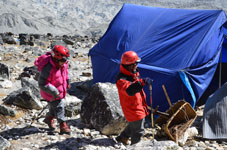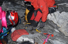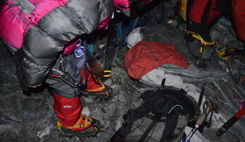 | ニマ・クライミングガイドさんは前夜ここまで登ってきて自身のスノーブーツやロープをデポされていました。 | ||