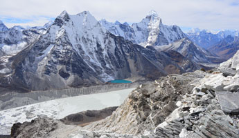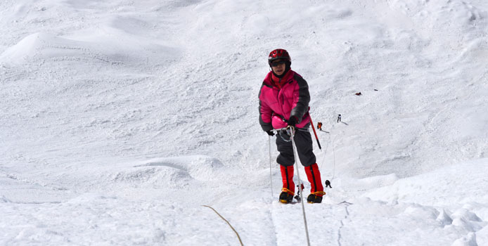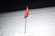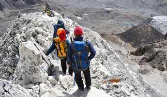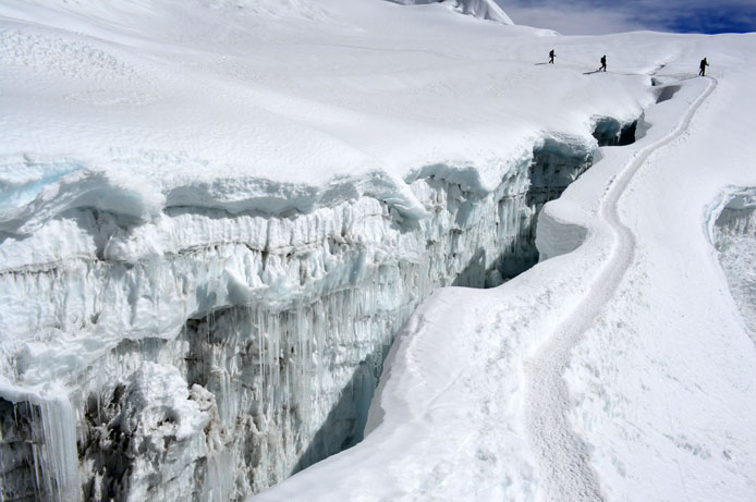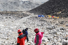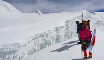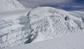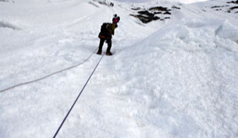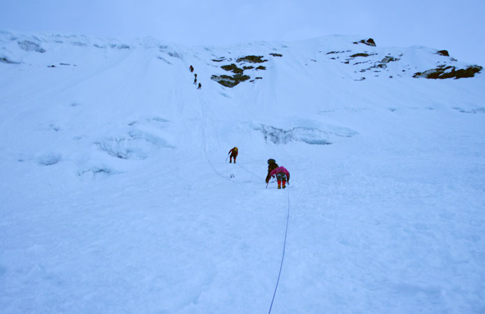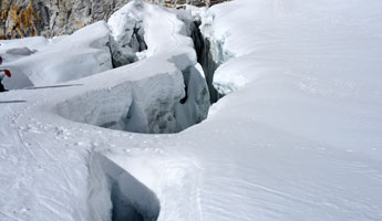 | アンザイレンでお互いを結び合ったものの、この辺りはヒドンクレバスの巣窟、いつ落下しても不思議はありません。またこの氷河全体が、岩山と岩山を跨ぐ大きなスノーブリッジのようなもの、氷河の下はおそらく大きな空洞にちがいありません。前日ニマ・クライミングリーダーが立てた漂竹の赤い布をたよりに進んでいきます。 | ||