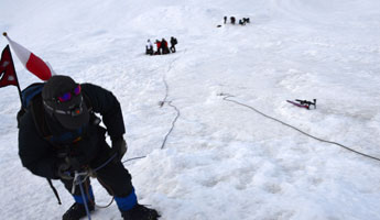 | もう一箇所のクレバスを通過すると広い雪原に出ました。もう何組か取り付いています。ここでアッセンションを使い氷壁を登るのかと思うと背筋に悪寒が走ります。 | ||||