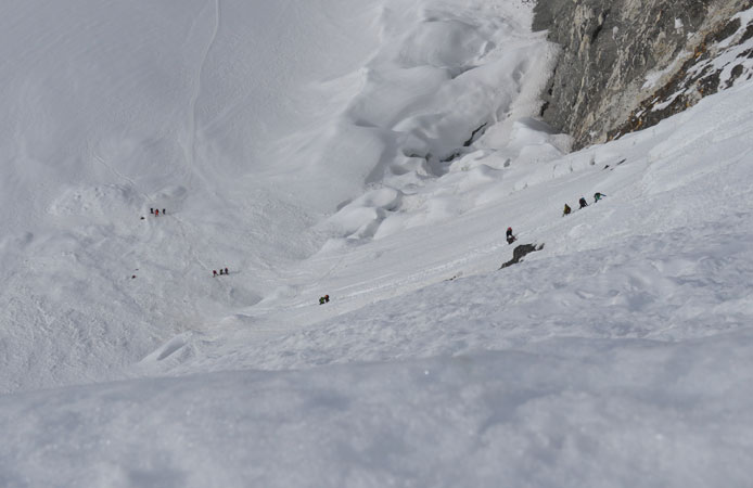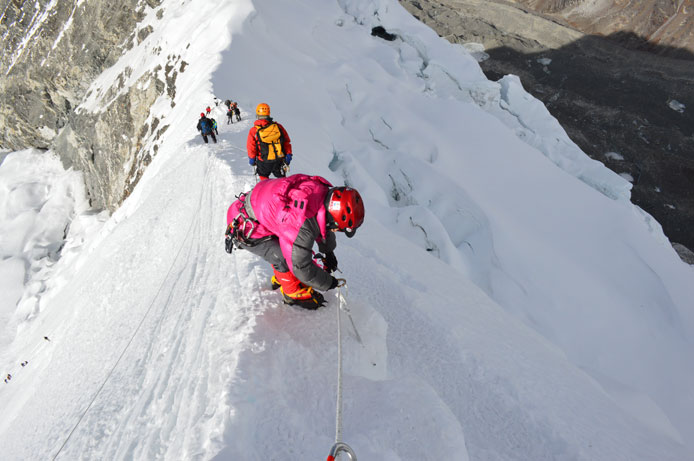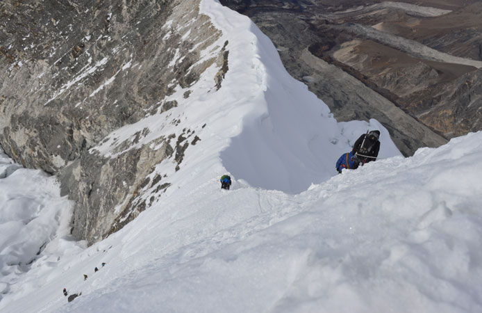 | ファンタスティック・リッジ到達点から頂上までさらにフィックスロープが延びています。カラビナを架け替え一歩また一歩。頂上に向かって歩いていきます。下を見るとまだ多くのクライマー達が順番を待っているようです。頂上では多くのクライマー達が大きな歓声をあげ、登頂を喜んでいました。 |