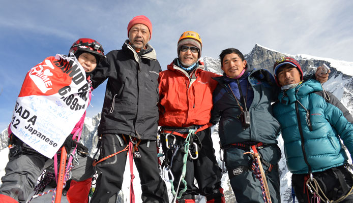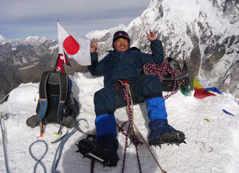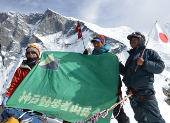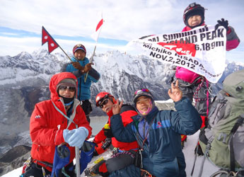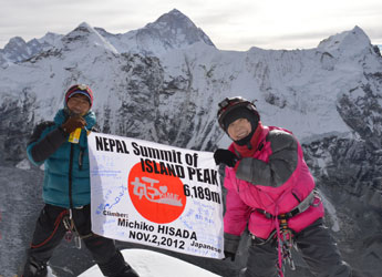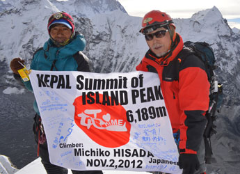| 「さあ最後の頂上めざして頑張りましょう!」えーっまだここは頂上とは違うのか!まだこれ以上上に行けと言うのか!解っていても、モゴモゴと文句を言いながらユマールのセットを仕替えて細く切り立った頂上へのリッジを辿ります。下山者との交差は大変です。リッジ上に張られた2本のフィックスロープはクロスしてるし、一本は大きくリッジから外れているし、もう生きた心地はしませんでした ネパール時間、朝7時40分。4人メンバーとガイド2人で登頂成功しました。6180bの上に立ちました。やりました。リュックから用意していた姫旗を出して大きく広げました。外人の中から「ブラボー」そんな言葉をかけてもらった気がします。あとは感動の涙です。 頂上はかなり狭く10人程がやっと立つことができるほどでした。記念撮影を済ませ後からやってくる人のために下山することにしました。 |
