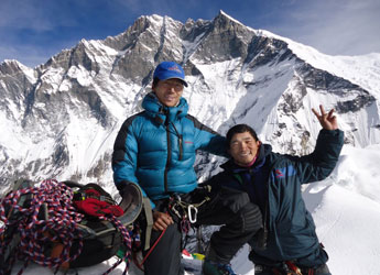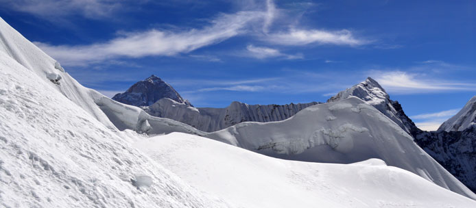| 頂上からは360度の大パノラマです。北にはローチェ・8516mが大きく聳えている。このローチェの後ろ側にはエベレストがあるがここからは見えない。 東側にはマカルー・8485mが浮かんでいる。南側のファンタスティックリッジの先にはアマダブラムが見える。周囲の峰峰の名前は解らないが日本では見ることができない景色だ。 |