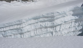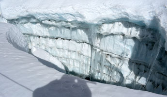 | 全員が懸垂下降を終え、下降終了点で全員そろったあとリーダーがロープ回収してくるのを待ち、往路と同じくアンザイレンを結びアイゼンをひっかけないように、クレバスの縁を慎重に下りて行きました。明るくなってから見るクレバスは限りなく深く、引き込まれるような錯覚さえ起こすほどでした。 |