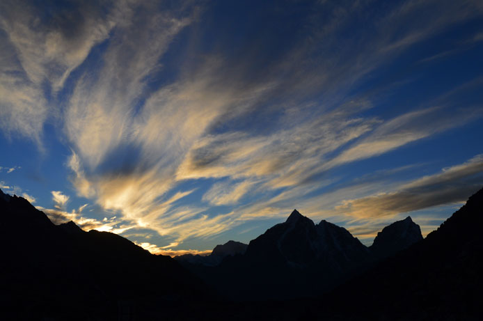 | 何とかハイキャンプに到着。ここで2時間ほど眠らせてもらって、更に下のベースキャンプに戻ったときには西の空は夕暮れの様相になっていました。 | ||