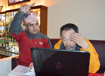 Mr.ビシャールとジャムジャムクラブ社長はツアーの打ち合わせ中です。 私達はウッチー会長に別行動中の取材です。地図を広げ辿ったルートを確認しながら 「ここはきつかったなあ」 「此処の景色はよかったなあ」 などと回想しながら話を伺いました。 病院で書いたというスケッチを見せてもらい、写真とはちがう表現力に驚きました。 |