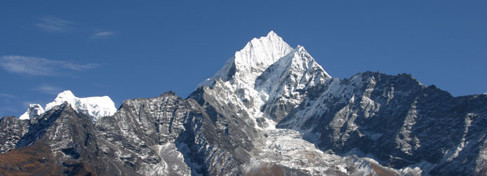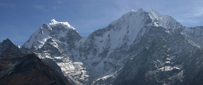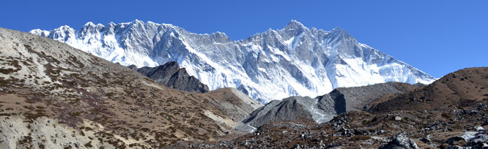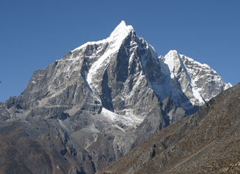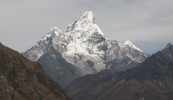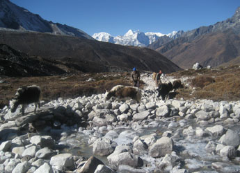 | 昨日はディンボチェから重い足を引きずりながら、このローチェの良く見えるところまでやってきた。ローチェ氷河から流れ出る川の畔に立ち、明日はベースキャンプに入るアイランドピークの山容を遠めに見ながら感慨にひたった。 しかし体調が一晩で一変。もうここから上に行く脚力も気力も失せていた。もうイムジャ・コーラの流れに逆らうことはない。流れに沿って下っていくだけかと思うと少々寂しい気がする。 他のメンバーも顔には出さないがどこか寂しそうだ。 朝8時30分ベースキャンプに向かう本隊は寂しさを吹っ切るように出発していった。もう追っかけることは無い。 |
