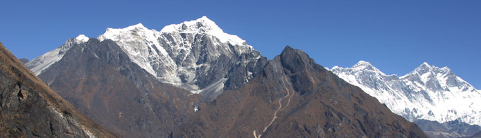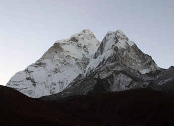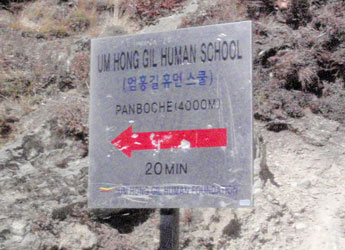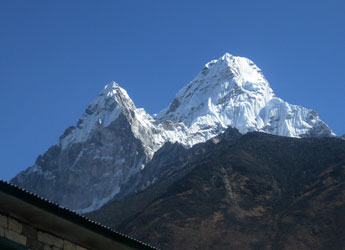 | 分岐にあった黄色い大きな看板とステンレスの看板。ステンレスの看板に書かれたPANBOCHE(4000M) ←の下に20MINの文字。ここからパンボチェまで4kmの距離を20分でいけると言うのか。信じられない気持ち。私の解釈ミスなのか。しかしまんざら違ってもいないだろう。現地のポーターさんの足取りを見ていたら、空身なら楽に登っていくだろうな、それもサンダル履で…とも思えてくる。 ここからティータイムの休憩地まで、わずかな登りだがゼェゼェハァハァと苦しさが続いた。苦しさに耐えて登った。御褒美なのか、このロッジのテラスから見ると、アマダブラムが真正面に見えとても綺麗だった。 |