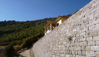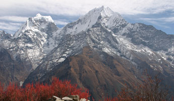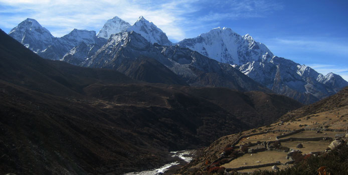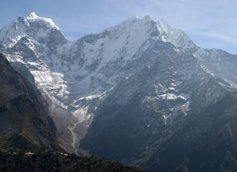 | 昼ごろになるとアップダウンが多くなってきた。咳が多くで出して歩きづらくなってくる。チャーチットとサントシの励ましを受けながら、足を引きづるように一歩また一歩。体重の半分くらいがストックにかかったような気がして歩きにくい。 昼すぎディンボチェから4時間かけてパンボチェに到着。渓谷と山並みが美しい。静養のため昼寝。 |