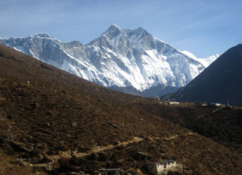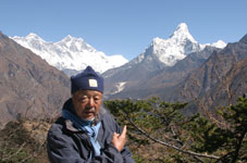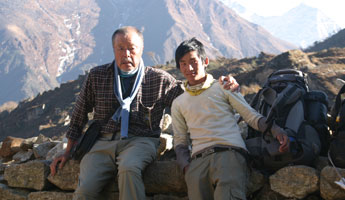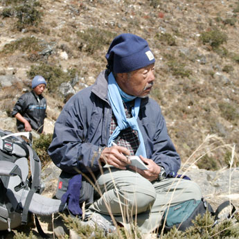 | この日はクムジュンまで行く。ポルチェから見たら対岸のポルチェテンガはかなり降りる感じに見えた。しかし其処に到達するためには一度谷底にかかるつり橋まで降りなければならなかった。この登り返しが一仕事あり大変だった。さらに厳しかったのは、途中のムングと言う集落で420bあがるのに4時間かかってしまった。 風邪に加え喘息も出てとても苦しかった。 昼前、本隊がアタック成功したとの連絡を受ける。良かった。チャーチットとサントシとともに手を取り合って喜ぶ。ついにやったか。あとは気をつけて、無事にベースキャンプに戻ってくれるのを祈るばかりなり。 |