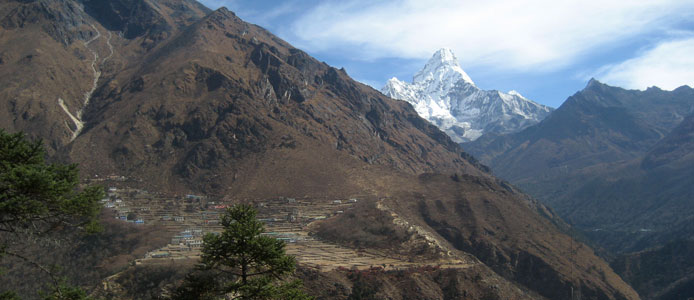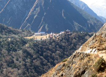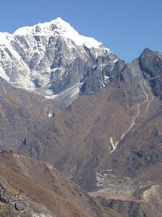 | ディンボチェを午前8時30分に出発し、下りだからという頭があるので案外スムーズに歩行できた。アマダブラムに向かうルートにかかる橋を、はるか眼下の谷底に見ながら、パンボチェの下の村と、上の村を分ける分岐まで50分で到達したことになる。現在9時20分、思ったより早く歩けている。 | |