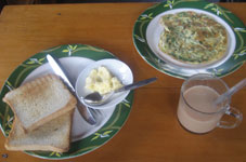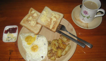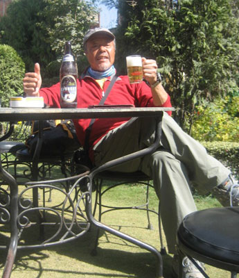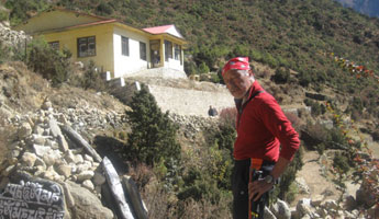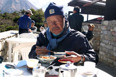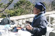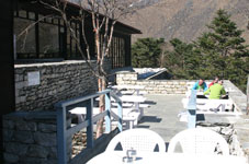 | 昨夜は疲労のあまり食欲が無かったが今日はリッチに豪華ランチとしゃれ込んでみた。1時間かけてエベレストを眺めながらのランチである。メニューはチキンかつ丼とケーキを食べた。 昼食費としては4540ルピー支払う。奥さんに知れたら大目玉を食らうかもしれない。でもこれで元気回復。 エベレストビューホテルは満員のため宿泊できないので、少し下ったところに有るパノラマホテルで宿泊することに決める。 エベレストビューホテルからパノラマホテルへは僅かな時間で到着。 チャーチットとサントシに、パノラマホテルに同宿をするように勧めるが「ナムチェで泊まって明日の朝早く上がってくる」と言い、かたくなに同宿を拒否する。しかたなく一人で泊まる事にした。 その後1時間静養のための昼寝。 |