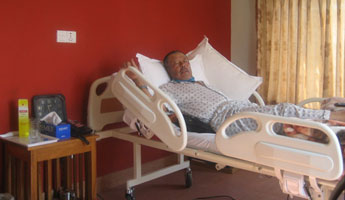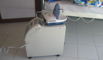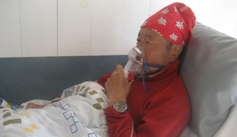 | 朝食のあと、診療所へ向かった。 ナムチェの町は馬蹄形の緩い谷間の傾斜に形成されている。診療所はその一番上に位置していた。まだ新しい建物だ。受付で看護婦らしき人に申し出ると、此処の規定で最低80ドルはかかるが持っているかと言う、「大丈夫、金はあるという」と女医さんが出てきた。 此処一週間の症状を詳しく説明すると聴診器を当てられ、脈拍をとられ、血圧を測定され、咽喉、鼻腔を診察された後、診断が下った。 「すぐに酸素吸入をうけなければならない」といわれベッドに横たわって酸素吸入をうける。 「次に肺の感染症にかかっている恐れがある」と診断され、ヘリコプターをすぐに呼ぶからカトマンズの病院にかかった方が良いとの見解。 |
