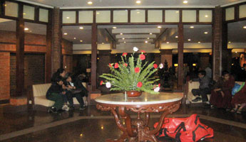 本隊と合流のためホテルを「カトマンズ ホテル・SAMSARA」に移動。 チャーチットと庭先で到着を待つことにした。 |