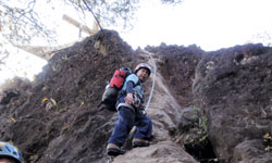| ロープを肩に巻き姫との間を3mほど開けてショートロープビレイで進む。初めての鎖場上部にすすむ。かなり長そうな鎖場である。ここも立ち木に支点を取りロアーダウンでゆっくりと降ろしていく。左に振られたら岩場から外れて宙ぶらりんになる。 |