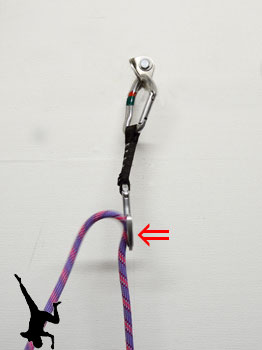 | 必ず『ストリング』等のウェビングプロテクターが付いているクイックドローを使用します。 アンカー側のカラビナは自由に動くことができる必要がありますので『ストリング』などを付けないでください。 ロープ側のカラビナは『ストリング』を付けて固定します。 |