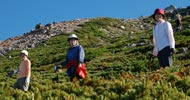 午後5時の夕食の時間まで何とか間に合いました。食券を持って食堂の入り口に並びます。食堂は山小屋では珍しいバイキングもどきでした。不平不満は申しませんが麓の永井旅館の料理が恋しいよ〜。沈む夕日を楽しみ、午後8時30分の消灯の後は星空を楽しみ明日の登山にむけて早々と眠りについたことと思います(デパスという誘眠剤飲んだのに朝まで眠れなかったよ〜) ●7月21日(祝日)快晴です。山小屋に流れる曲に合わせてラジオ体操をしたのち午前7時00分御前ケ峰の山頂をめざしました。ザックは山小屋に預けて身軽に登ります。昨日の疲れは何処吹く風でみなさん元気の様子です。1時間ほどで山頂に到着。2702.2メートルの感動の地を踏みしめます。快晴で空は澄み、遥か彼方には御岳、槍ヶ岳と360度の展望を思い思いに楽しむことができました。気分爽快です。しばらくの間、写真撮影を楽しみ、再び小屋に戻り身支度を整え、いよいよ下山です。午前9時、山小屋を出発。復路はアルプス展望歩道を歩きます。南竜ケ馬場休憩所10時40分到着。山頂では寒く感じた気温も、高度を下げる度に下界の暑さが感じられるようになってきました。汗も半端じゃありません。甚之助避難小屋への分岐からは往路と |