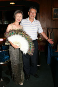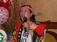 | 乾杯の発声が済むと、食って、食って、飲んで、飲んで(この間少しだけ静かでした)カラオケの皮切りは珍しくジョンさんで「旅姿三人男」だったと思います。せっかく股旅物の衣装があるのですからと着せ替え人形状態で変身していきみんなの拍手喝采を浴びました。トップというのは勇気がいるものです。しばらくしてジョンが私の足下に気が付きました。私の今日のお履き物は地下足袋!です。昔私のガイドもどきのファンという方が手作りでプレゼントしてくれた貴重な地下足袋なんです。ということで地下足袋に似合う「岸壁の母」を熱唱?しました。あとは堰を切ったように歌が続きます。途中でユカイナの演奏を聴きました。甲斐駒&仙丈岳登山の時にアドベンチャーさんが買い、練習を重ねた成果を聞かせて頂きました。 |